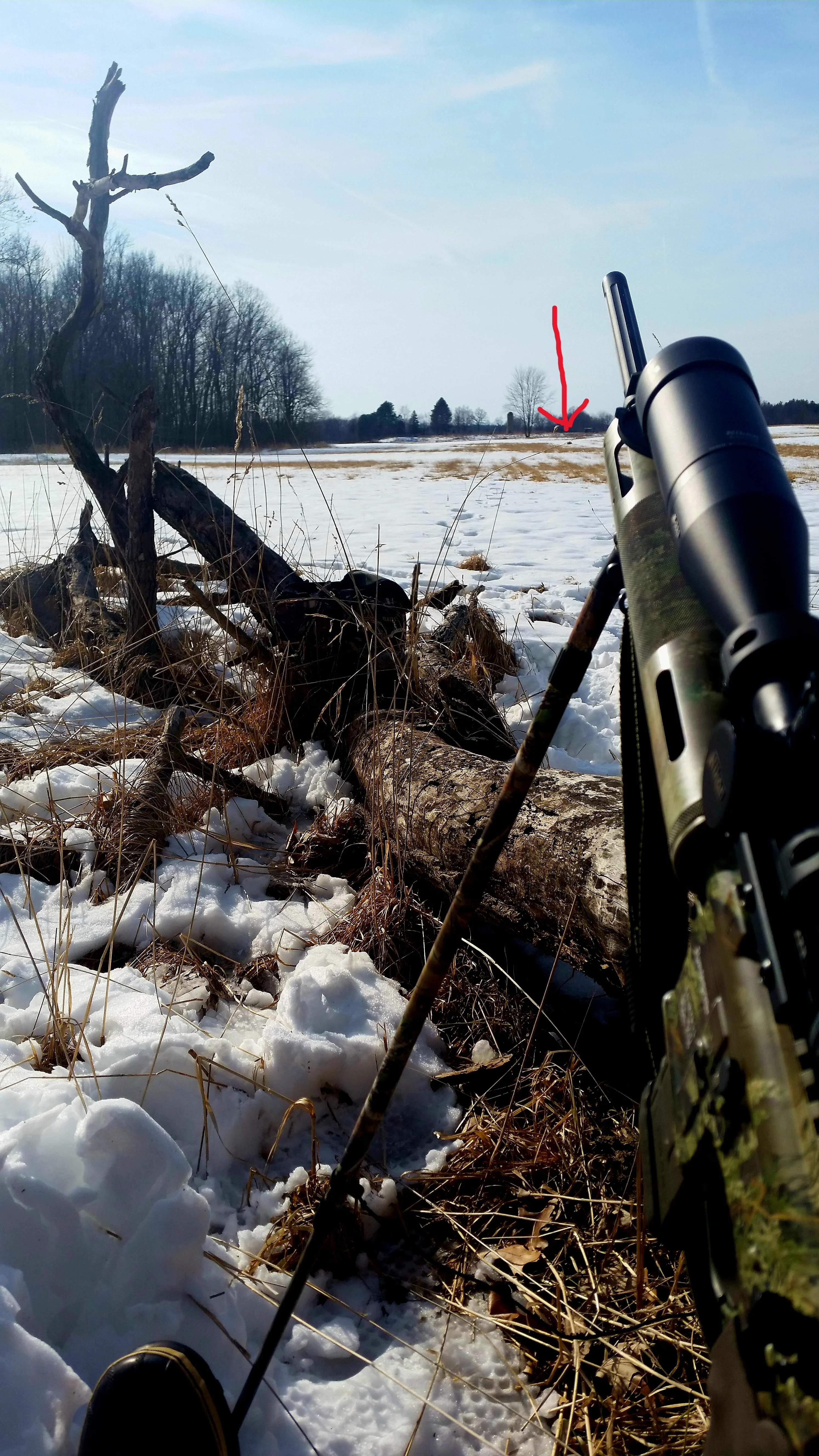 This is one of my favorite 'Go-To' spots in the field behind my house. I don't hunt it until the farmer is done cutting hay for the year. I've put the smack-down on quite a few yotes breaking the wood line running out to my Fox Pro caller/decoy combo. I have it set-up about 150 yards out (the little speck below the red arrow). Pretty much a chip shot with my Remington R-15 VTR Predator .223 rifle. I just throw on my ASAT Ghillie suit and sit in my folding chair with my back to the wood line next to a few deadfalls for cover.